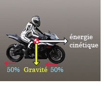 Lorsque vous freinez, le poids de la moto travaille à la fois contre la distance de freinage ainsi qu'en faveur de celle-ci puisque la moto aura tendance à conserver sa vitesse. Plus elle est lourde, plus elle sera difficile à arrêter. Ces deux mécanismes se compensant l'un l'autre, vous aurez besoin de trouver une autre énergie pour stopper la moto. Mais cette compensation s'applique au poids total. N'oublions pas que le poids d'une moto est en fait réparti sur ses deux roues et que cette répartition ne va pas constamment être de 50/50 comme sur le dessin.